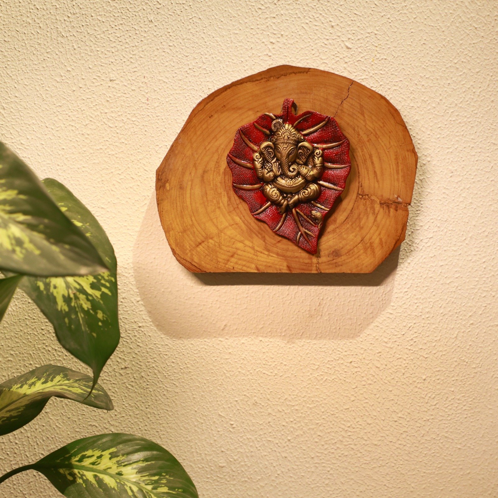 Auspicious Handcrafted Brass Ganesha Leaf on Natural Wood Wall Decor