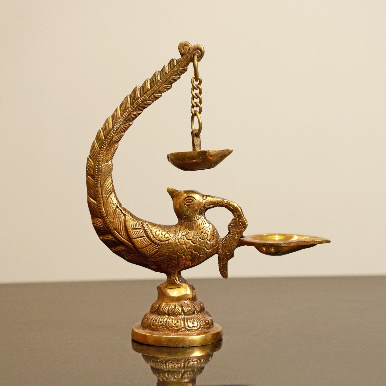 Illuminate your sacred space with the timeless beauty of this Handcrafted Brass Peacock Diya with Hanging Bell. Featuring a gracefully sculpted peacock design with detailed feather carvings, this diya exudes elegance and spiritual energy.