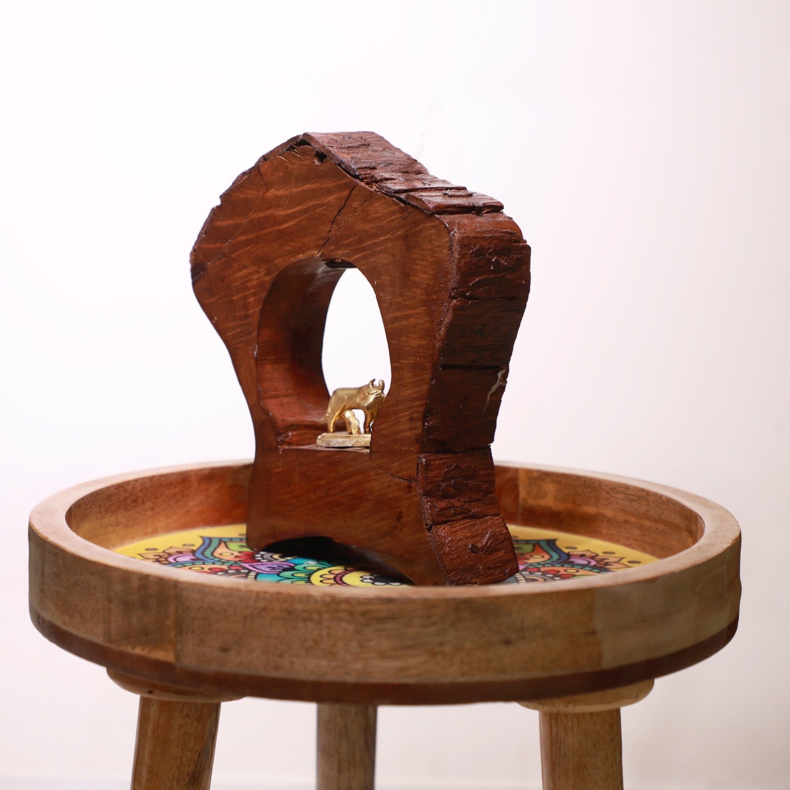 Witness the perfect harmony of nature and craft in this iconic Brasswood Studio piece. A miniature handcrafted brass Nandi bull rests within a frame of organically shaped, solid wood. The rustic edge contrasts beautifully with the polished shine of the figurine, embodying devotion and strength. Measuring high, wide, and thick, this distinct accent brings a warm, artisanal feel to any desk or shelf. It is a thoughtful and truly special home décor gift celebrating the blend of earth and metal.