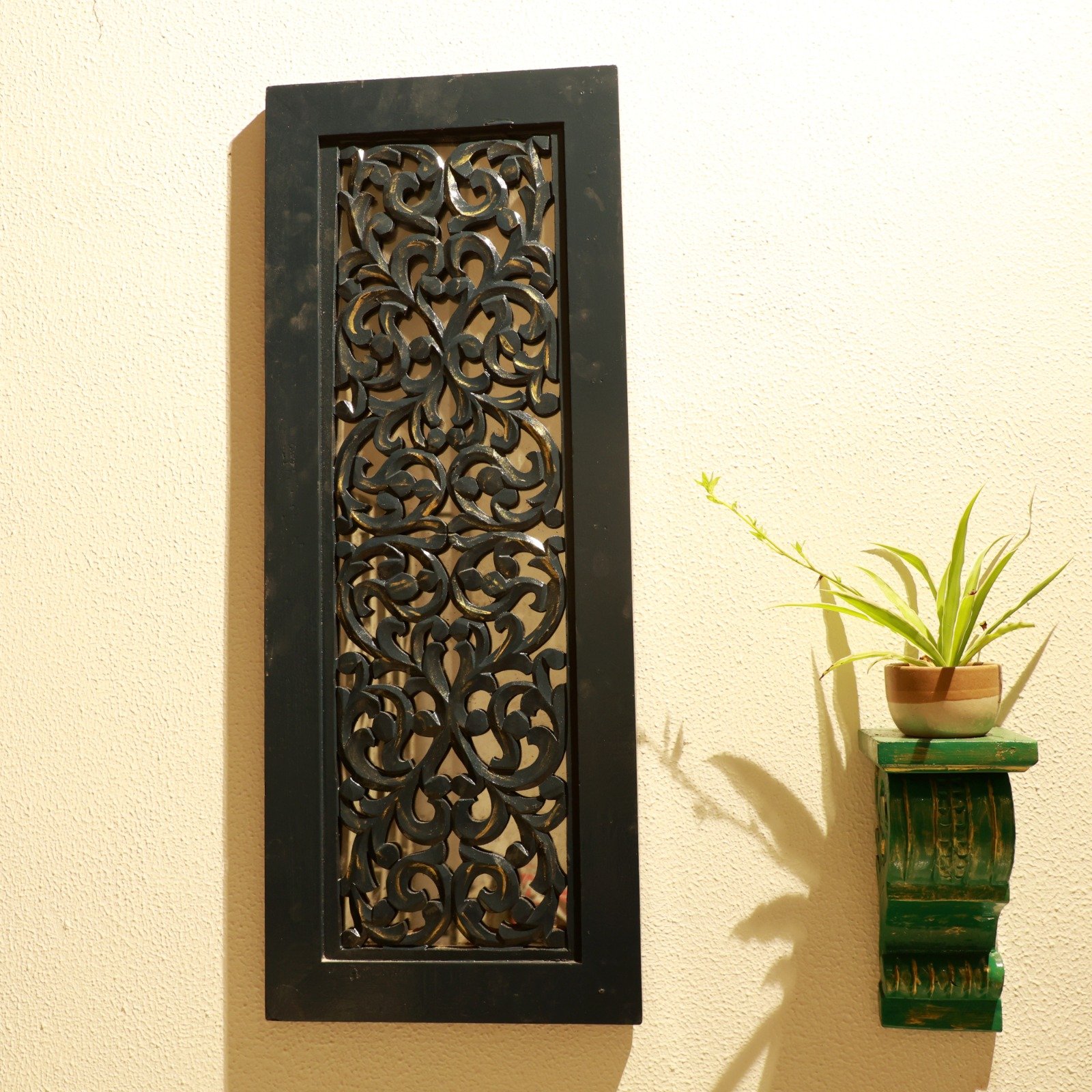 A tall wooden wall panel featuring detailed hand-carved floral patterns in a deep, muted finish. The openwork design adds texture and shadow, giving the piece visual depth without heaviness. Works beautifully as a vertical accent on blank walls or narrow spaces. Ideal for living areas, corridors, or layered décor setups. Elegant, architectural, and quietly striking.