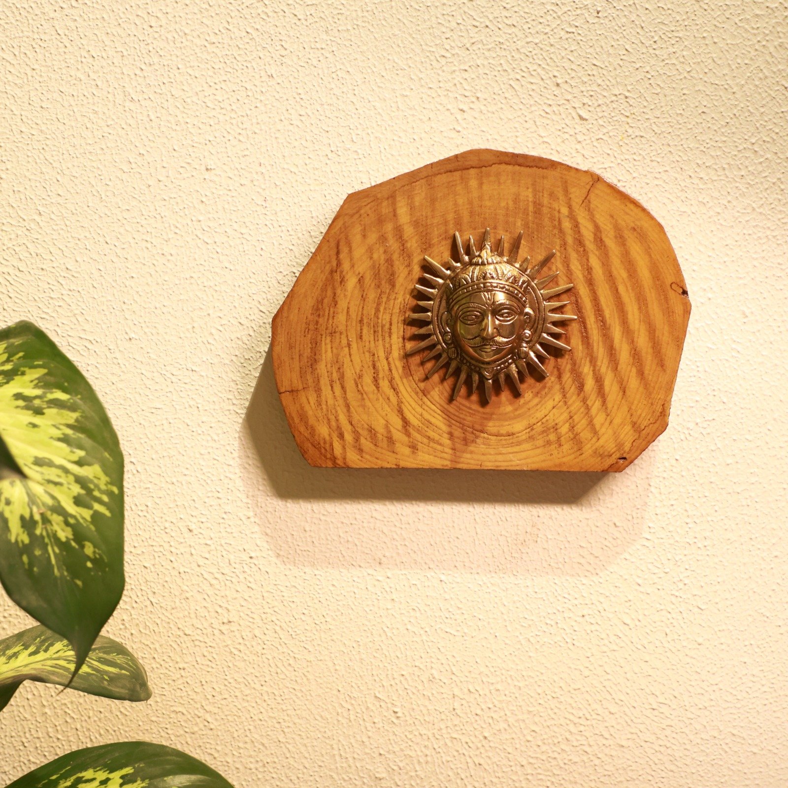 Radiant Handcrafted Brass Sun God on Natural Wood Wall Decor
