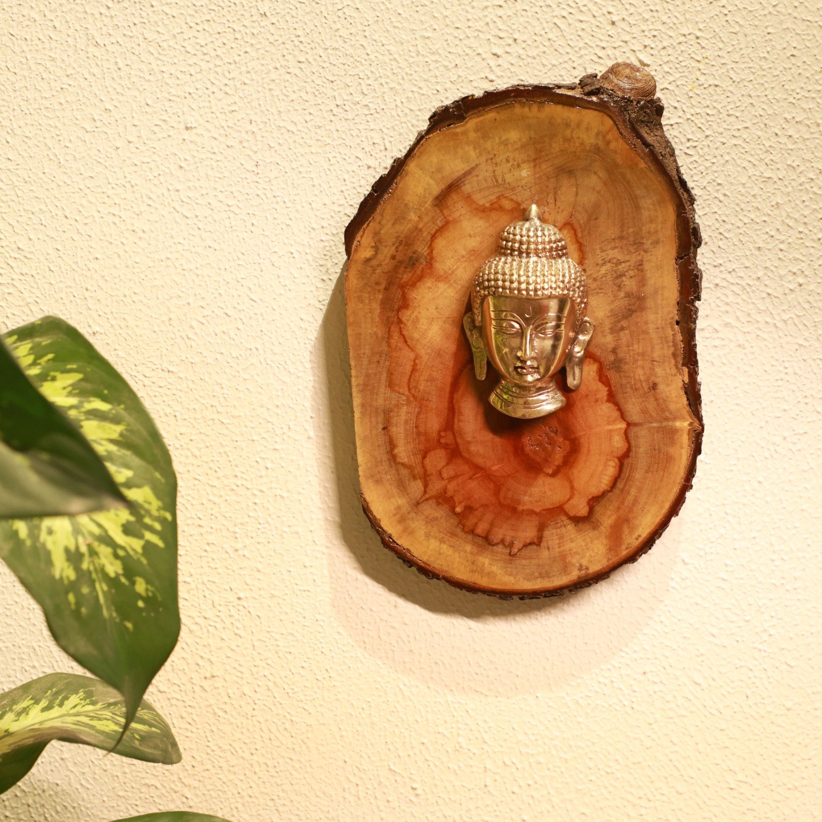 Serene Handcrafted Brass Buddha Face on Natural Wood Slice Wall Art